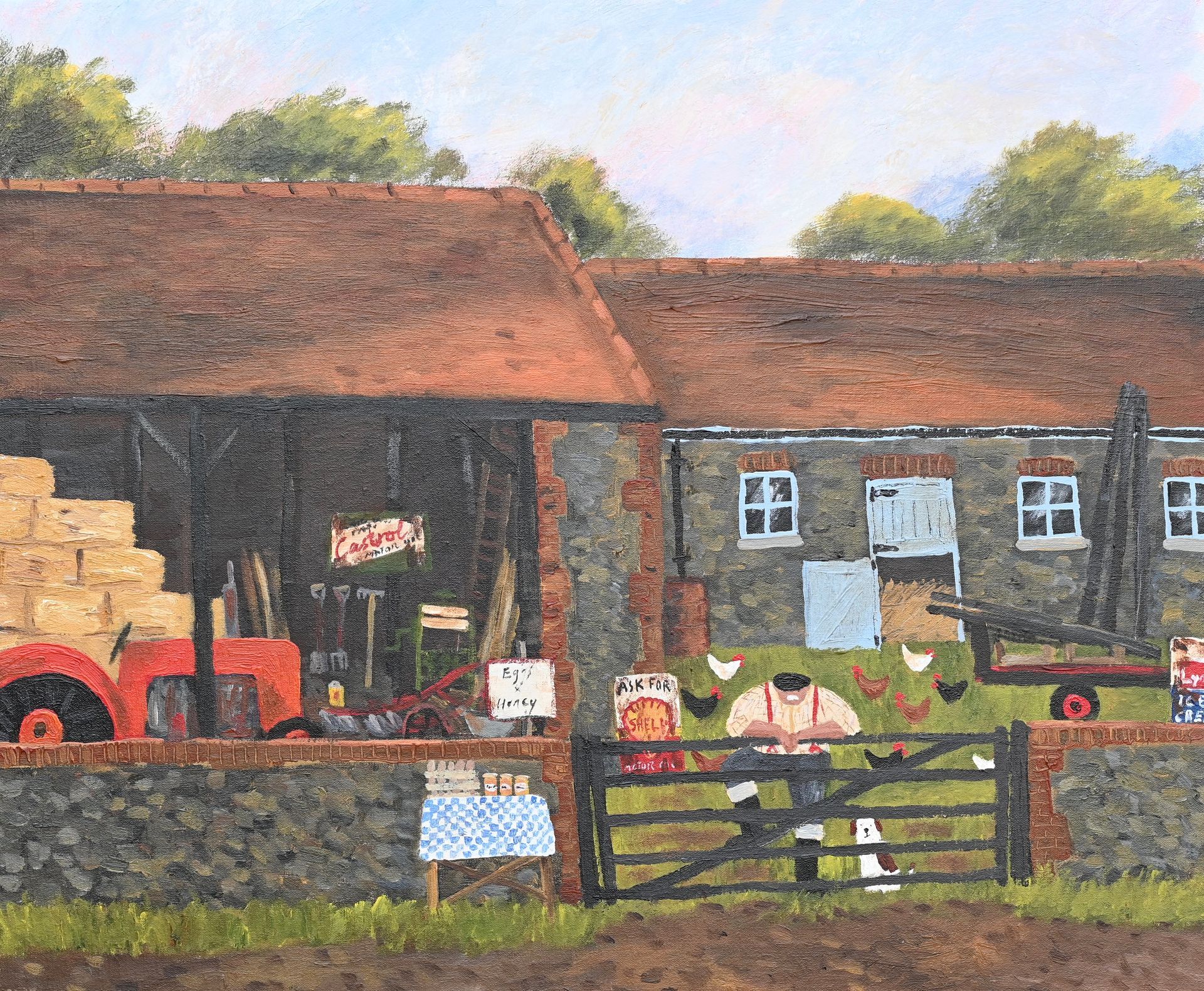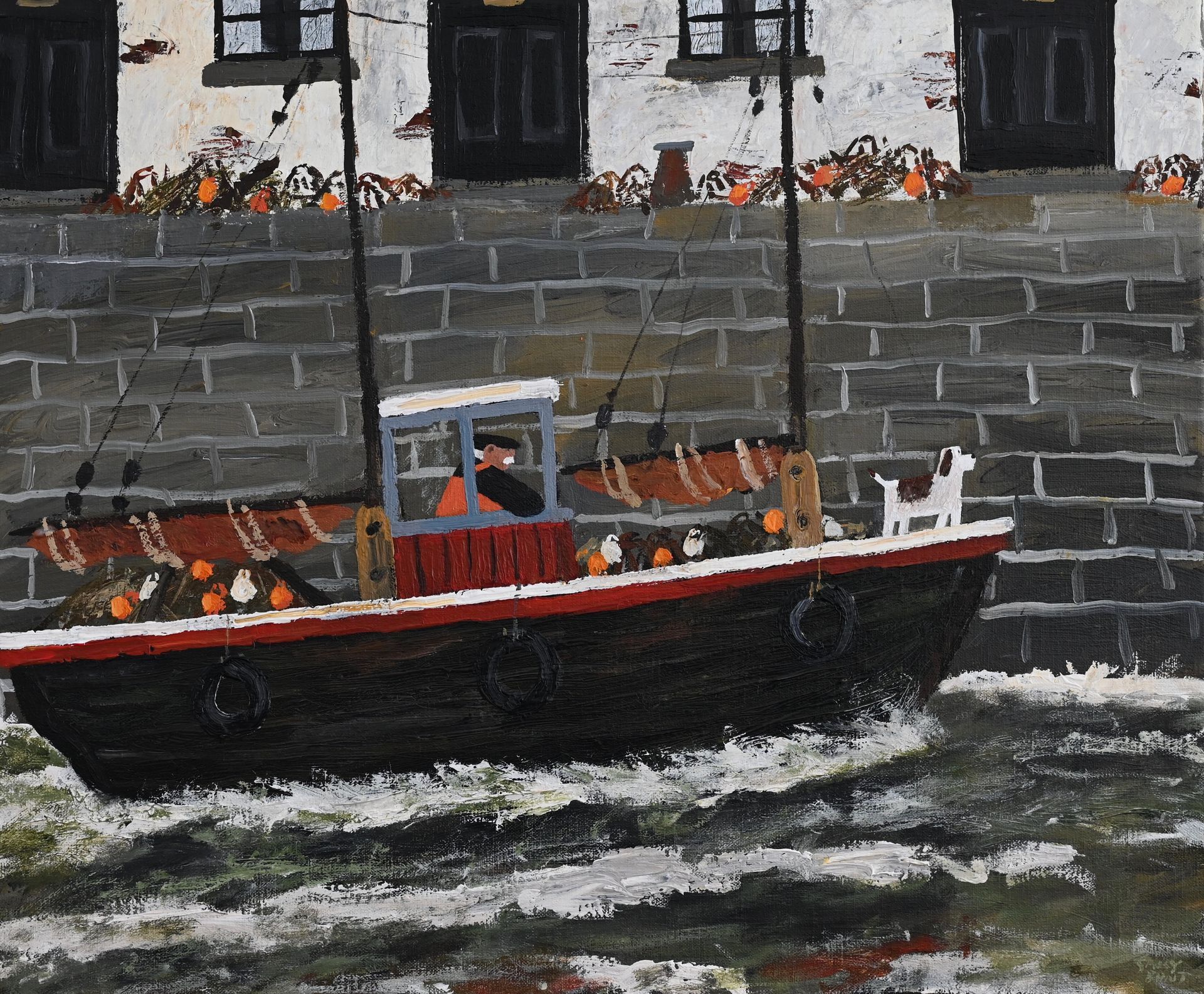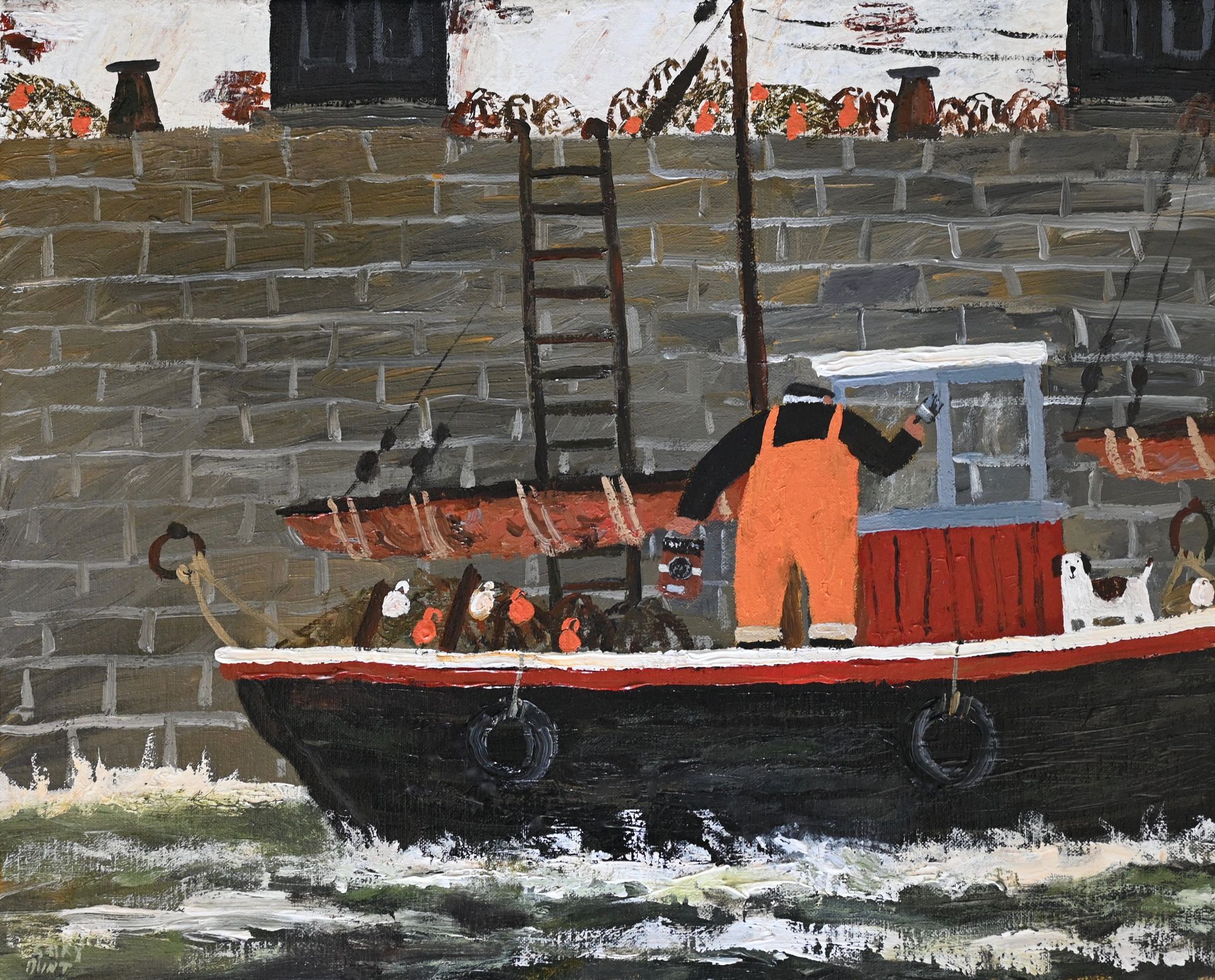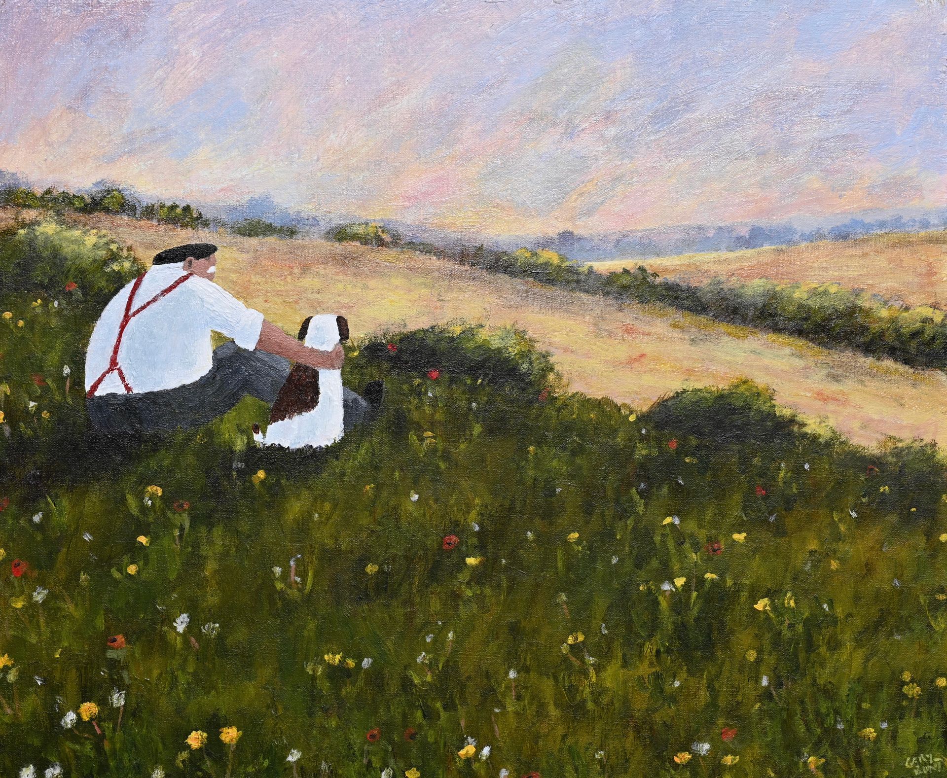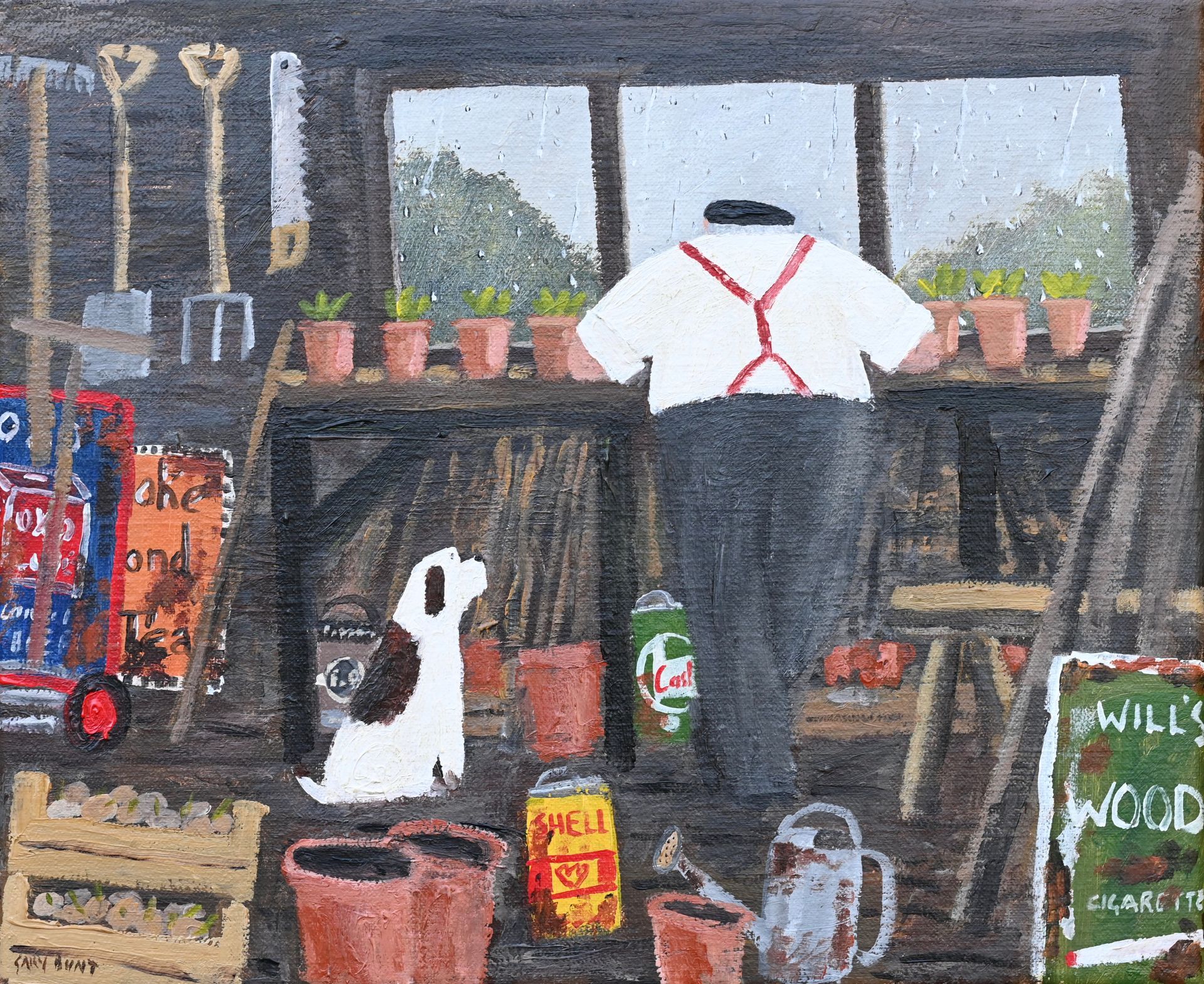 In the barrow his dog looks on